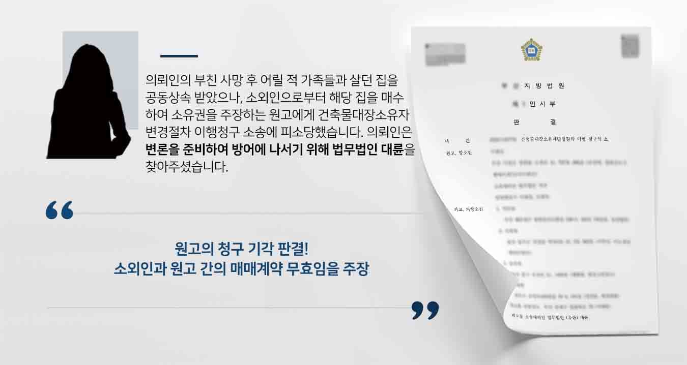 만약 건축물대장소유자변경절차 이행청구 소송 등 위 사례와 비슷한 상황으로 곤란을 겪고 계시다면 언제든 법무법인 대륜으로 의뢰해 주시길 바랍니다.