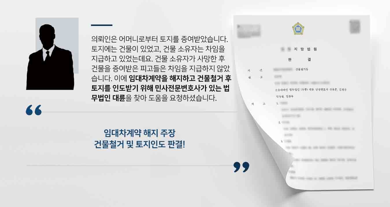 이에 의뢰인은 건물철거 후 토지인도를 받을 수 있게 됐습니다. 소송비용 또한 부담하지 않아도 돼 법무법인 대륜에 거듭 감사인사를 전하셨습니다.