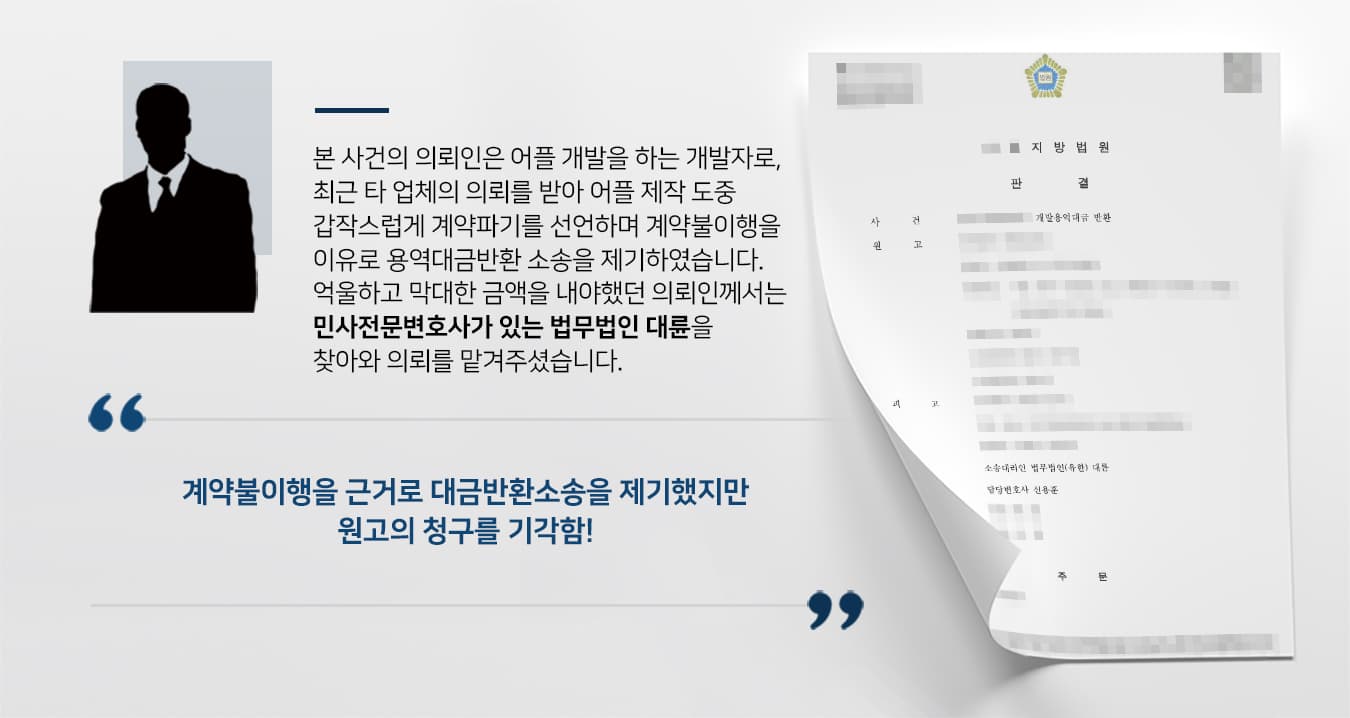 일하고 있던 도중, 의뢰를 맡긴 업체는 갑작스레 계약파기를 통보하였고 계약불이행을 이유로 용역대금 반환을 위해 소송을 제기하였다고 들었습니다.