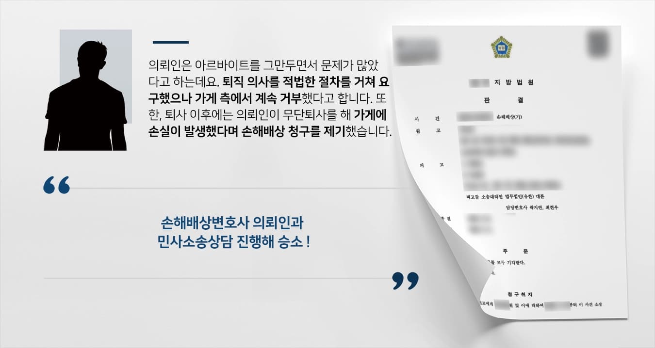 적법한 절차에 따라 퇴직 의사를 밝혔던 의뢰인은 가게 측으로부터 손해배상소송을 당하자 힘든 나날을 보내야했습니다.