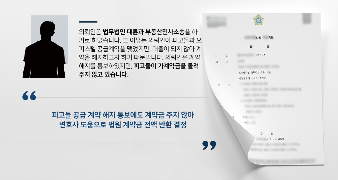 의뢰인은 공급 계약 시 가계약금을 전달하였는데, 계약을 해지하려고 했음에도 가계약금을 돌려주지 않았습니다.